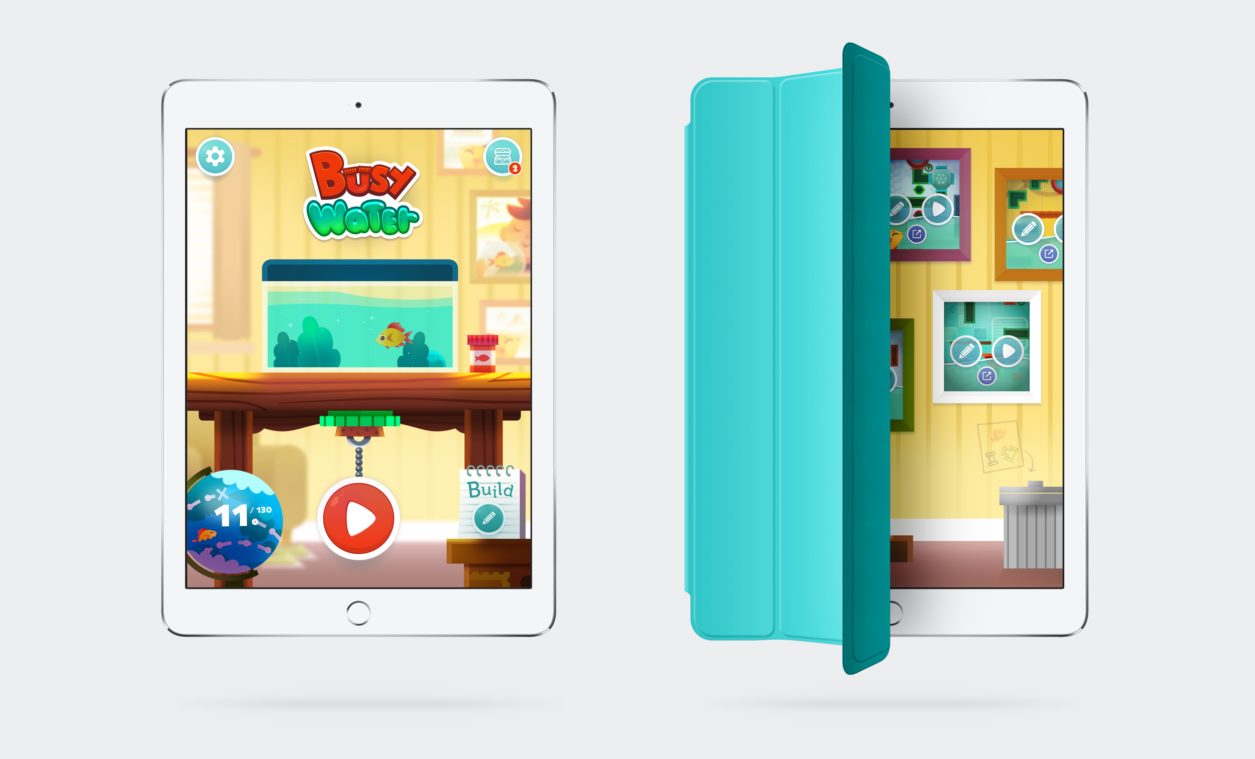 Busy Water is a critical thinking puzzle game based on amazing water physics. The objective: use pipes, spray, paddle wheels and blocks to help Archie, the fish get back to his tank. To help him, players are immersed in a water environment based on the Montessori method. Busy Water is a cross-platform app that is responsive to iPad, iPhone, Apple Watch and Apple TV. Open the app on your iPad or iPhone for fun critical thinking puzzles including a “Build Mode” where you can design and share your own personalized levels.